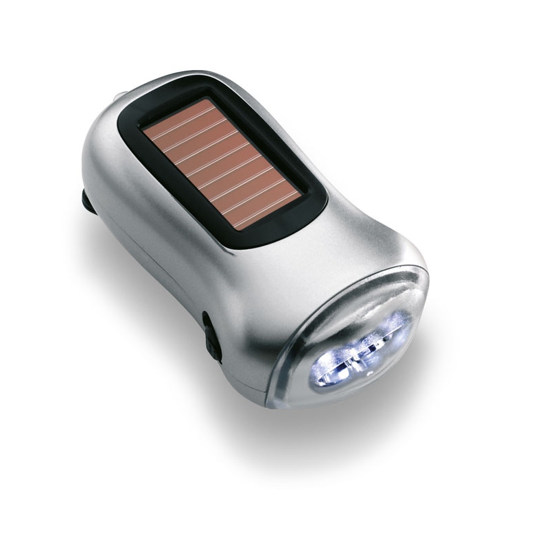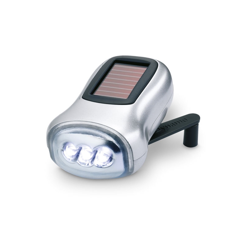 Duurzame zaklamp met zonnepaneel en dynamo, uitgevoerd in mat zilverkleurig ABS. Altijd licht zonder batterijen te vervangen.